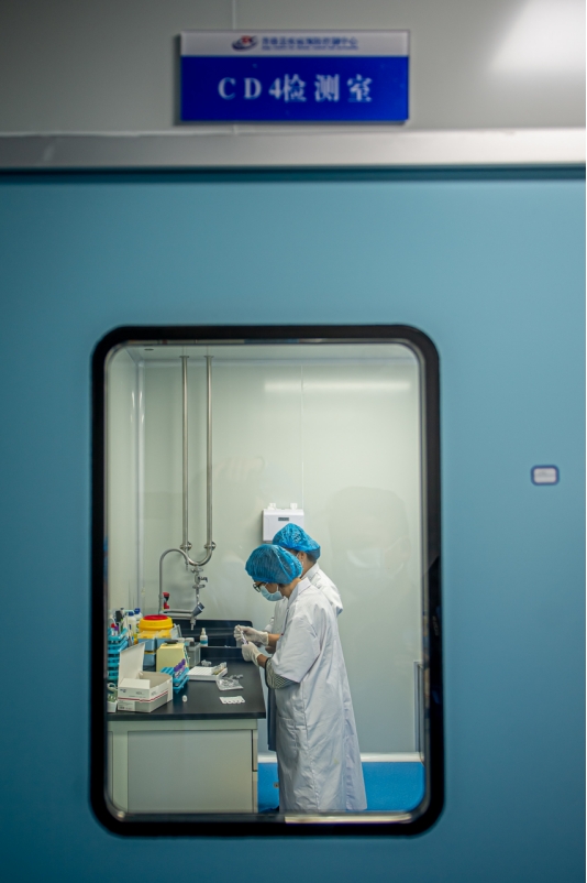 “爱心红丝带”项目工作人员在检测室工作