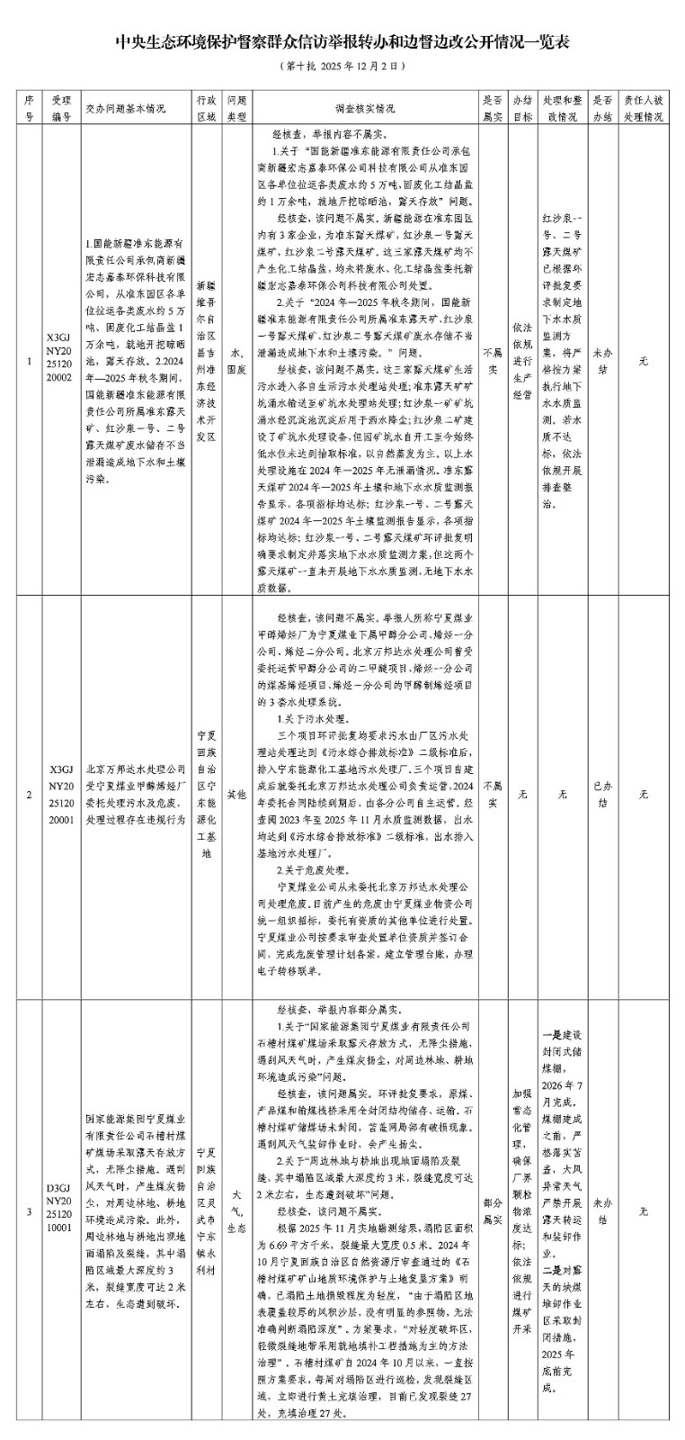 中央生态环境保护督察群众信访举报转办和边督边改公开情况一览表(第十批 2025年12月2日)