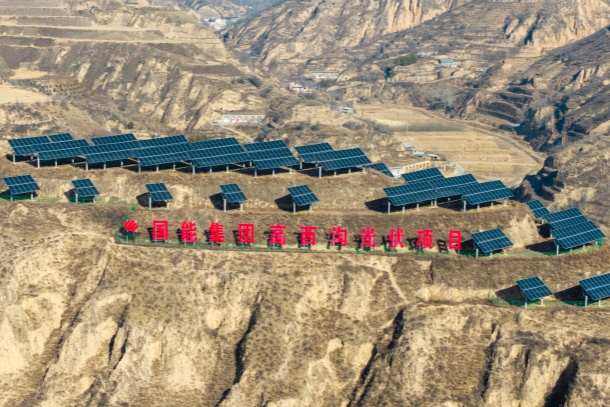 冬日,米脂县杨家沟与高西沟的山峁间,尽是沟壑纵横的苍茫,就在这一片苍茫之中,一排排深蓝色的光伏板错落有致地铺展在山坡上,在冬日暖阳的映照下熠熠生辉。